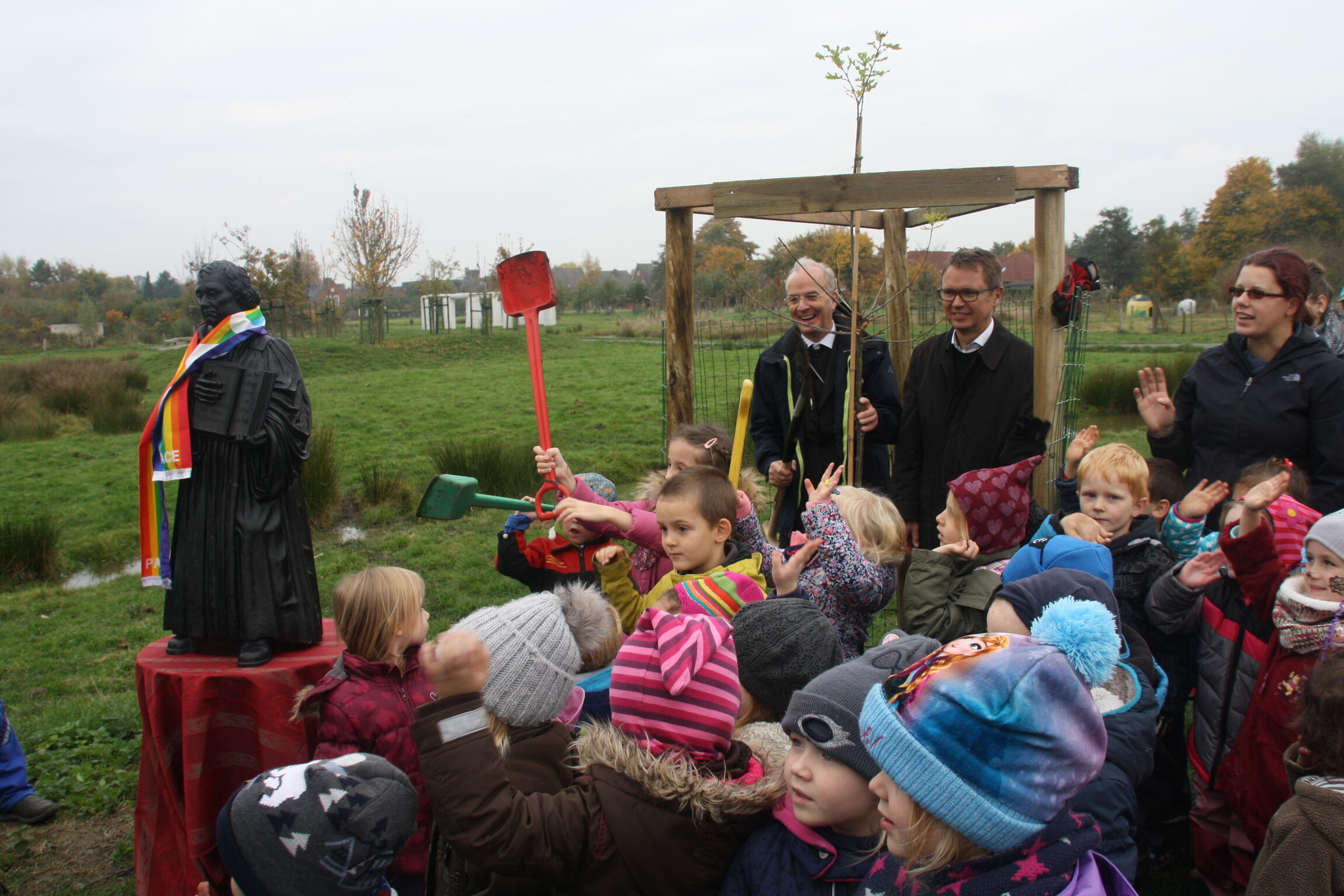 „Bäume sind Zeichen für Wachstum und Leben. Wer einen Baum pflanzt hat Hoffnung auf Zukunft. Die Luthereiche ist für mich ein bleibendes Erinnerungszeichen an den Ursprung der Reformation in Wittenberg vor 500 Jahren und an ihre weltweite Ausbreitung“, sagte Landessuperintendent Dr. Detlef Klahr. Der Regionalbischof pflanzte am Reformationstag, den 31. Oktober 2016, gemeinsam mit Wolfgang Ritter, dem stellvertretenden Superintendenten des Kirchenkreises Emden-Leer und Pastor der Erlöserkirchengemeinde in Emden-Borssum, und mit den Kindern des Kindergartens „Sonnenstrahl“ im Ökowerk Emden eine Luthereiche. Pastor Wolfgang Ritter sieht in diesem Pflanzort im Ökowerk Emden eine sichtbare Verbindung von Kirchengemeinde und Zivilgesellschaft: „Damit erhält nicht nur der Beginn des Jubiläumsjahres 500 Jahre Reformation ein lebendiges Zeichen, sondern auch die Verbindung der evangelisch-lutherischen Erlösergemeinde mit dem Ökowerk.“ Dadurch solle auch die große Bedeutung dieser Einrichtung für das gemeinsame Anliegen der Bewahrung der Schöpfung gewürdigt und hervorgehoben werden. Die guten Verbindungen zwischen Ökowerk und Kirchengemeinde seien über viele Jahre gewachsen. So fanden hier bereits Gottesdienste statt. Eckhard Lukas, Vorsitzender der Stiftung des Umweltzentrums, freute sich, dass die etwa drei Meter hohe Eiche ihren Platz an der Arche gefunden hat. Passend zur Arche waren Schweine, Hühner und Enten bei der Zeremonie dabei.