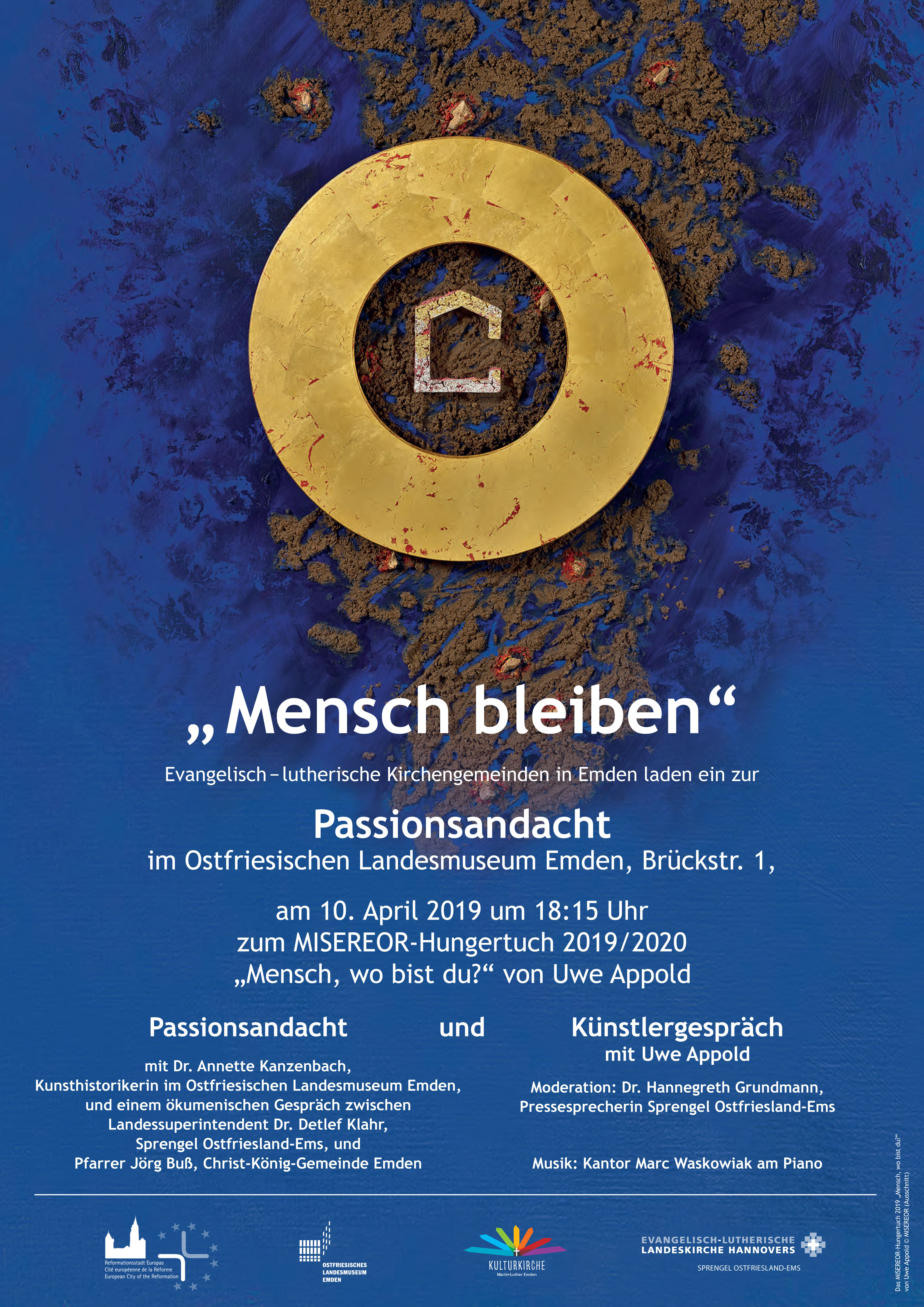 Unter dem Thema "Mensch bleiben" findet die letzte der diesjährigen sechs Passionsandachten am Mittwoch, den 10. April, um 18:15 Uhr im Ostfriesischen Landesmuseum Emden statt.