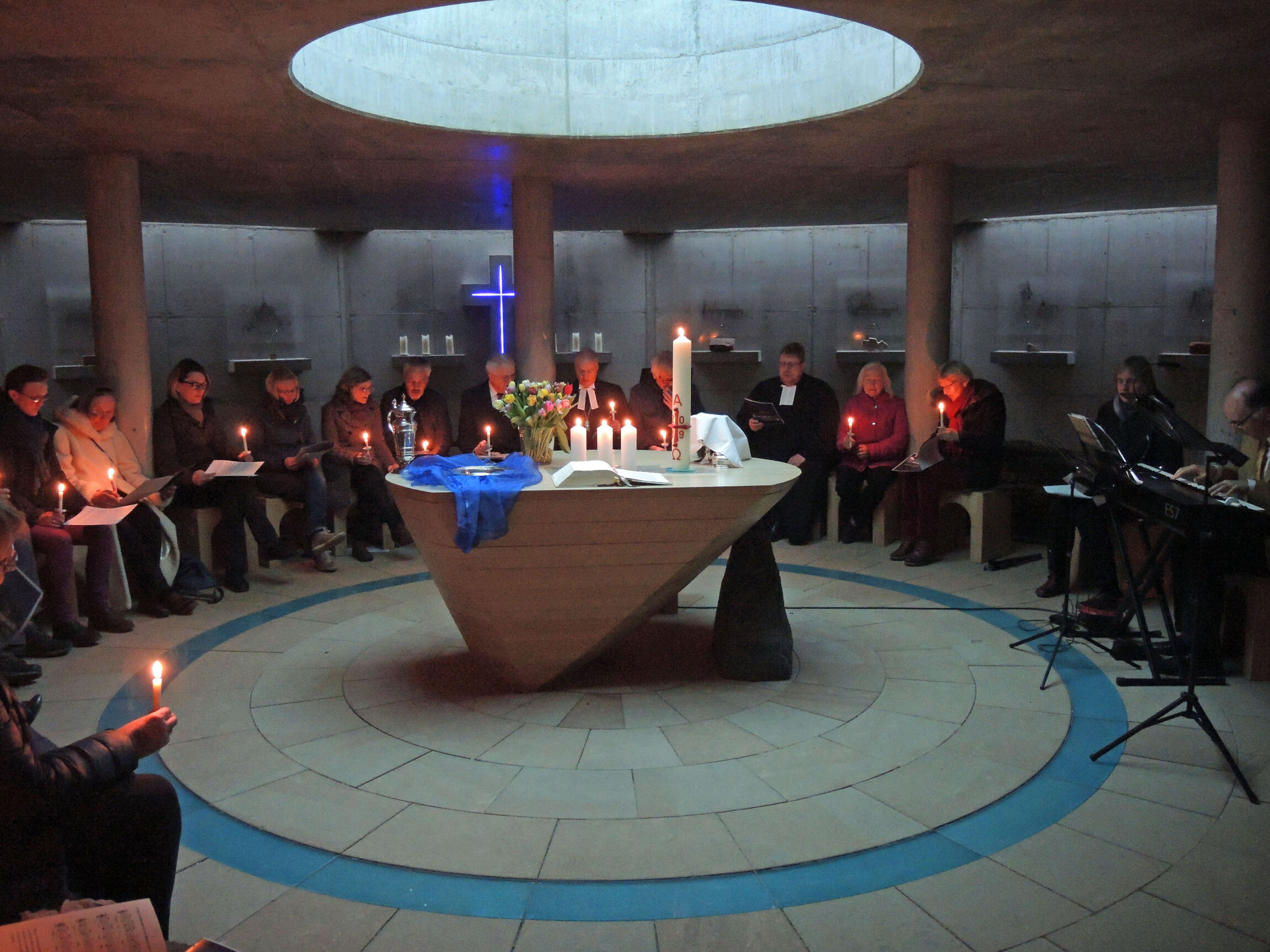 Zu Beginn des Gottesdienstes um 6 Uhr leuchtete im „Raum der Spurensuche“ nur das blaue Kreuz an der Wand hinter dem Altar, bis dann die große Osterkerze in den dunklen Raum hineingetragen wurde und dazu der Satz erklang: „Christus, Licht der Welt!“ Die brennende Kerze ist ein Zeichen dafür, dass Christus durch seine Auferstehung am Ostermorgen die Dunkelheit des Todes besiegt hat.