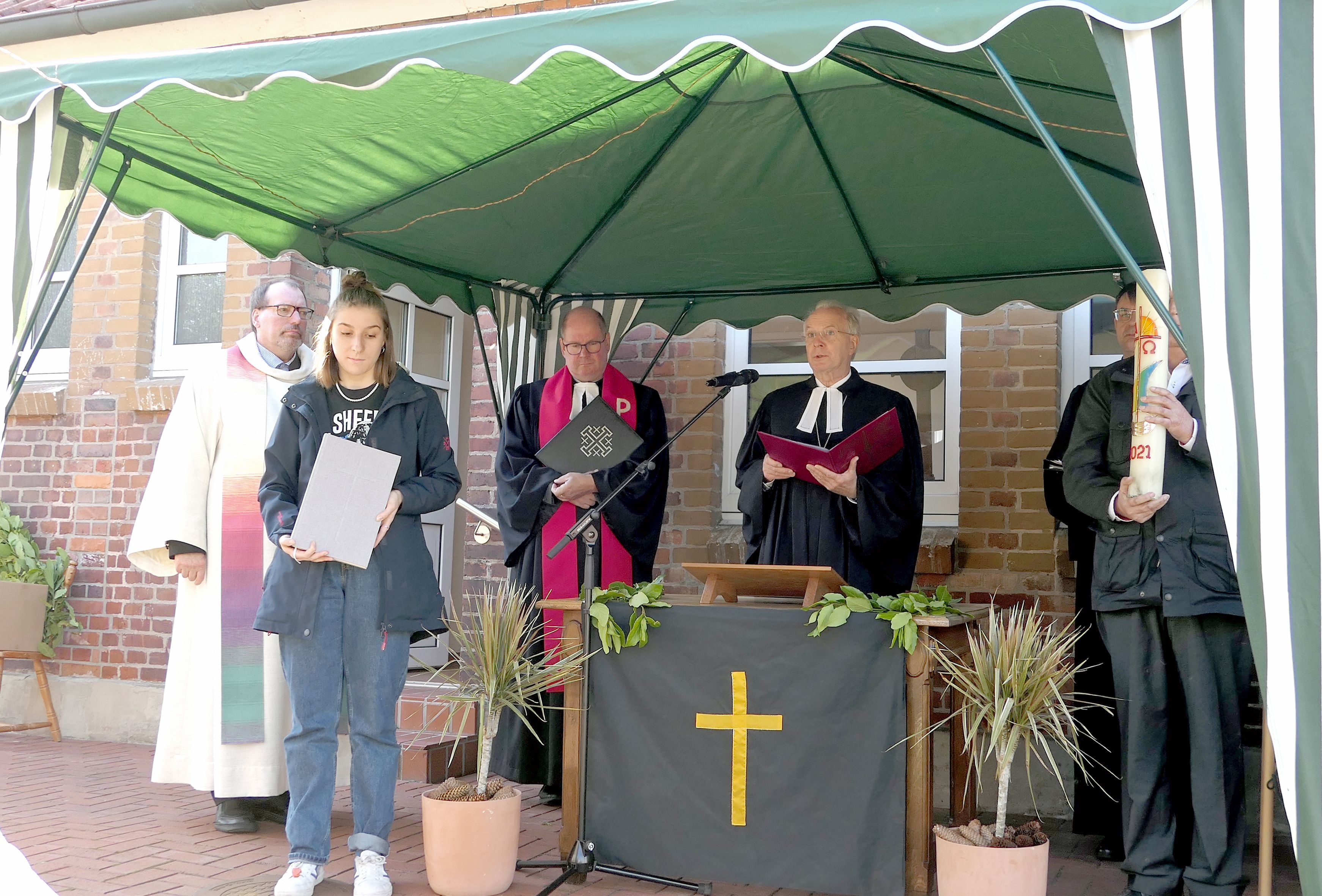 Aus der Konfessionsökumene hat Pastor Jürgen Altmeppen von der römisch-katholischen St. Isidorgemeinde im Gottesdienst mitgewirkt. Außerdem beteiligte sich neben Pastor Achim Heldt auch der Superintendent des Evangelisch-lutherischen Kirchenkreises Emsland-Bentheim, Dr. Bernd Brauer.