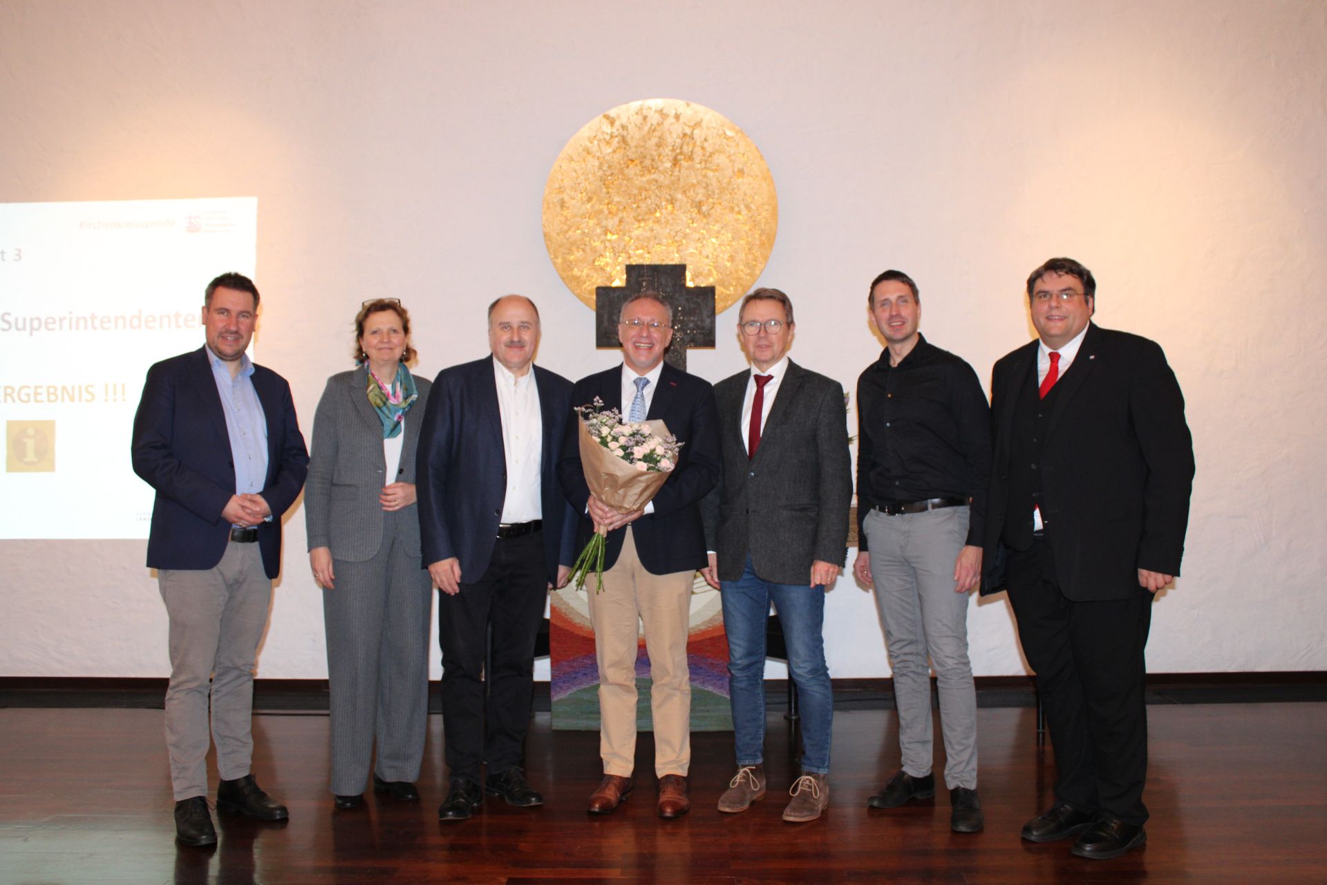 Foto v.l.n.r. Andreas Zachmann (Landeskirchenamt), Regionalbischöfin Sabine Schiermeyer, Sven Grundmann (2. stellv. Superintendent), Frank Mertin, Wolfgang Ritter (1. stellv. Superintendent), Benjamin Jäckel (1. Stellv. Vorsitzender des Kirchenkreisvorstandes) und Daniel Aldag (Vorsitzender der Kirchenkreissynode)