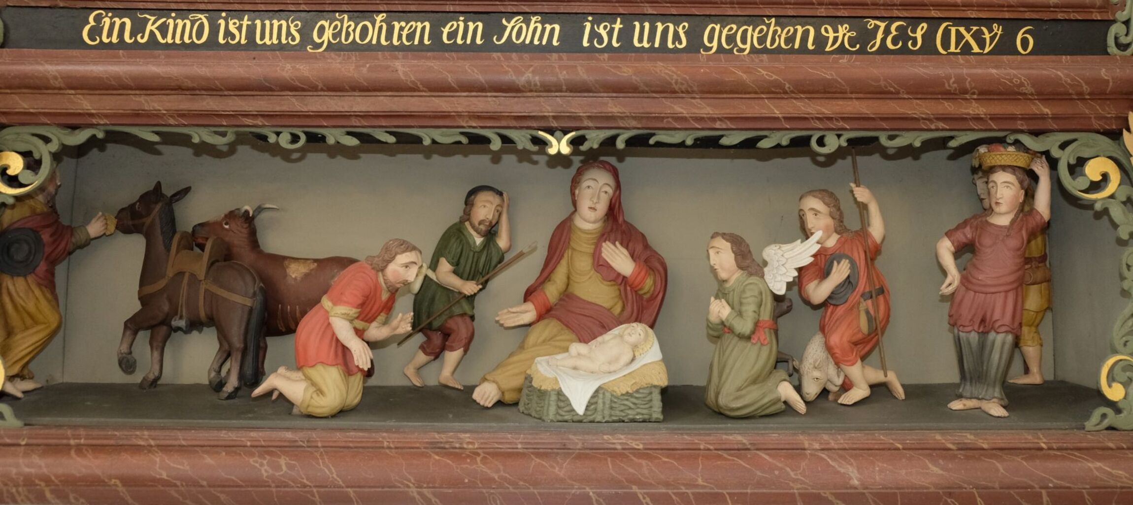 Wir sollen dieses Wunderbare auf keinen Fall verpassen. Dafür hat der Holzschnitzer gesorgt. Er legte einen Strahlenkranz um den Kopf des Jesuskindes. Die goldene Überschrift am Altar erzählt auch dem Letzten: „Ein Kind ist uns geboren, ein Sohn ist uns gegeben“. Der betende Engel beweist, dass hier gerade der Himmel die Erde berührt. Das Leben wird gut: Einer gibt den Tieren Futter. Eine bringt einen Korb mit Köstlichkeiten.