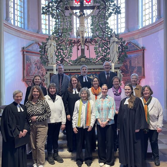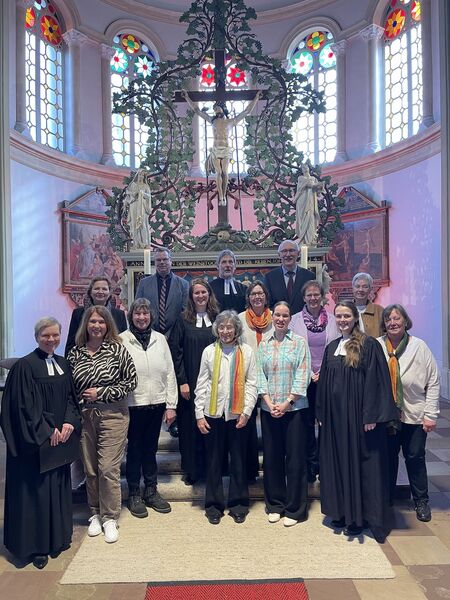 - Vor dem Altar der St. Magnus-Kirche Esens: 1. Reihe (von links nach rechts), Eva Hadem (Superintendentin), Manuela Schmidt- Franzen, Ingrid Siebels, Brigitte Just, Iris Willms, Anais Berghem (Pastorin), Alma Cassens