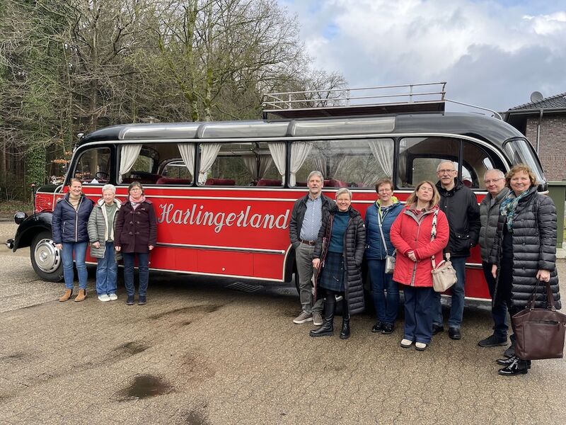 - Mit dem Oldtimerbus „Harlingerland“ die Region erkunden., v.l. Anna Bernau (Pastorin), Thea Buss, Maike Tannen, Thomas Arens (Pastor), Eva Hadem (Superintendentin), Silvia Kozlowski- Egberts, Manuela Schmidt- Franzen, Ingo Snell, Helmuth Eiben (stellvertretender Bürgermeister von Moorweg), Sabine Schiermeyer (Regionalbischöfin).