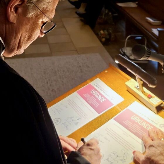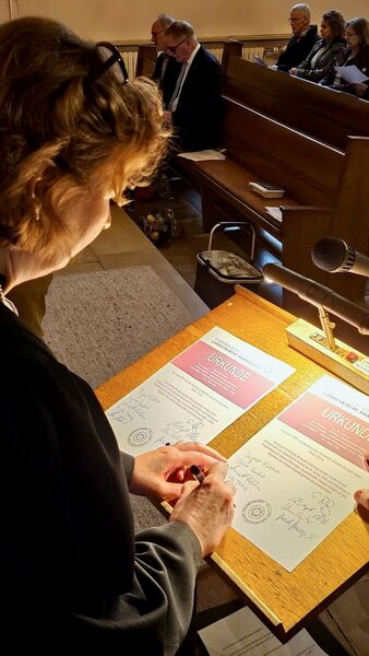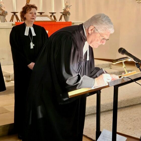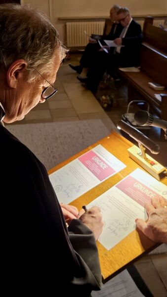 Ein besonderer Moment war die Ehrung von Johannes Willms, der nach über 30 Jahren ehrenamtlicher Tätigkeit verabschiedet wurde. Superintendent Kersten überreichte ihm das silberne Facettenkreuz der Landeskirche Hannovers. Zum Abschluss wurde die Fusionsurkunde unterzeichnet.