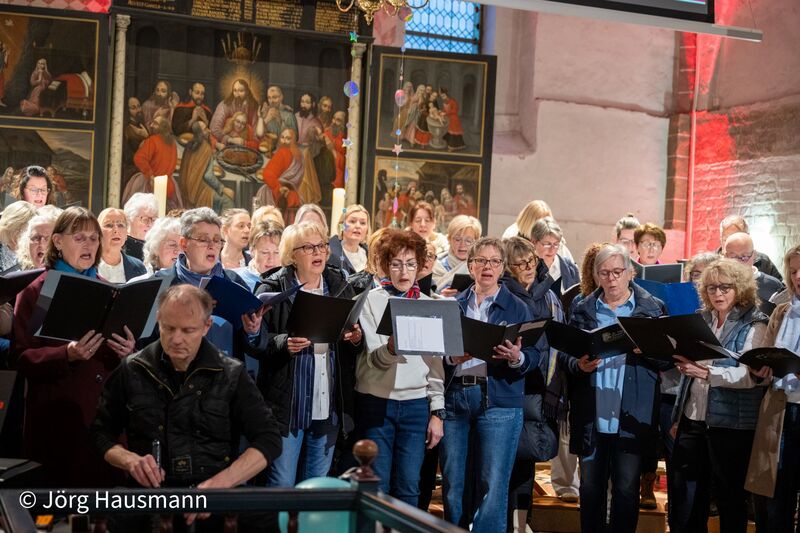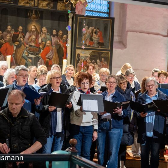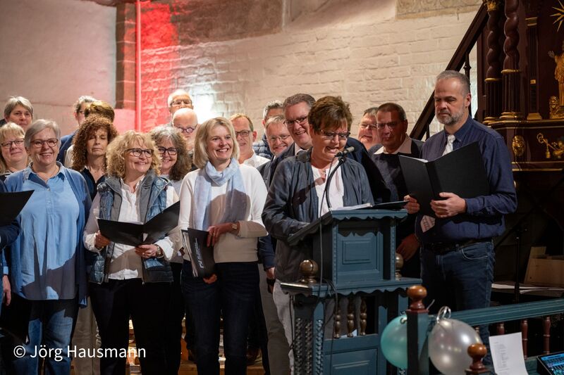 Mehr als 60 Sängerinnen und Sänger aus dem gesamten Kirchenkreis - von Ockenhausen über Uplengen, Rhauderfehn bis zum Rheiderland - standen für diesen Abend in einem Projektchor im Rampenlicht. Geleitet wurde der Chor von Kirchenkreiskantorin Heike Kieckhöfel. Am Cajon sorgte Hansi Reinke aus Collinghorst für die passende rhythmische Begleitung. In lediglich drei konzentrierten zweistündigen Proben im Gemeindehaus war ein musikalisch anspruchsvolles Programm erarbeitet worden, das das Publikum sichtbar begeisterte.